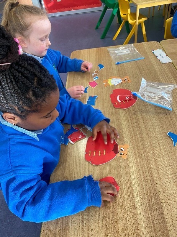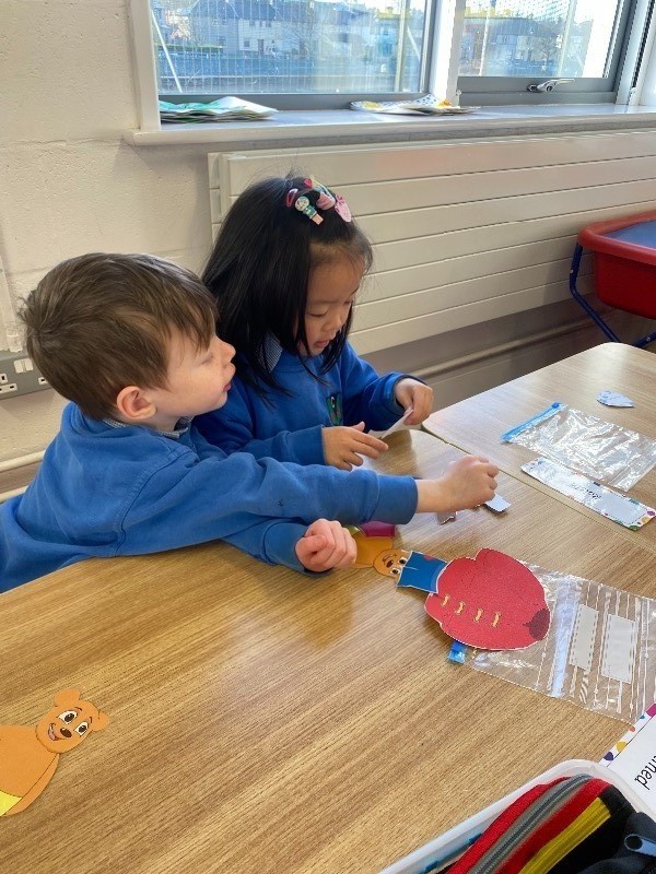 - Gaeilge: using different clothes, the children practiced dressing teddy. They worked in pairs saying, cuir bríste/geansaí/cóta/sciorta/hata air.